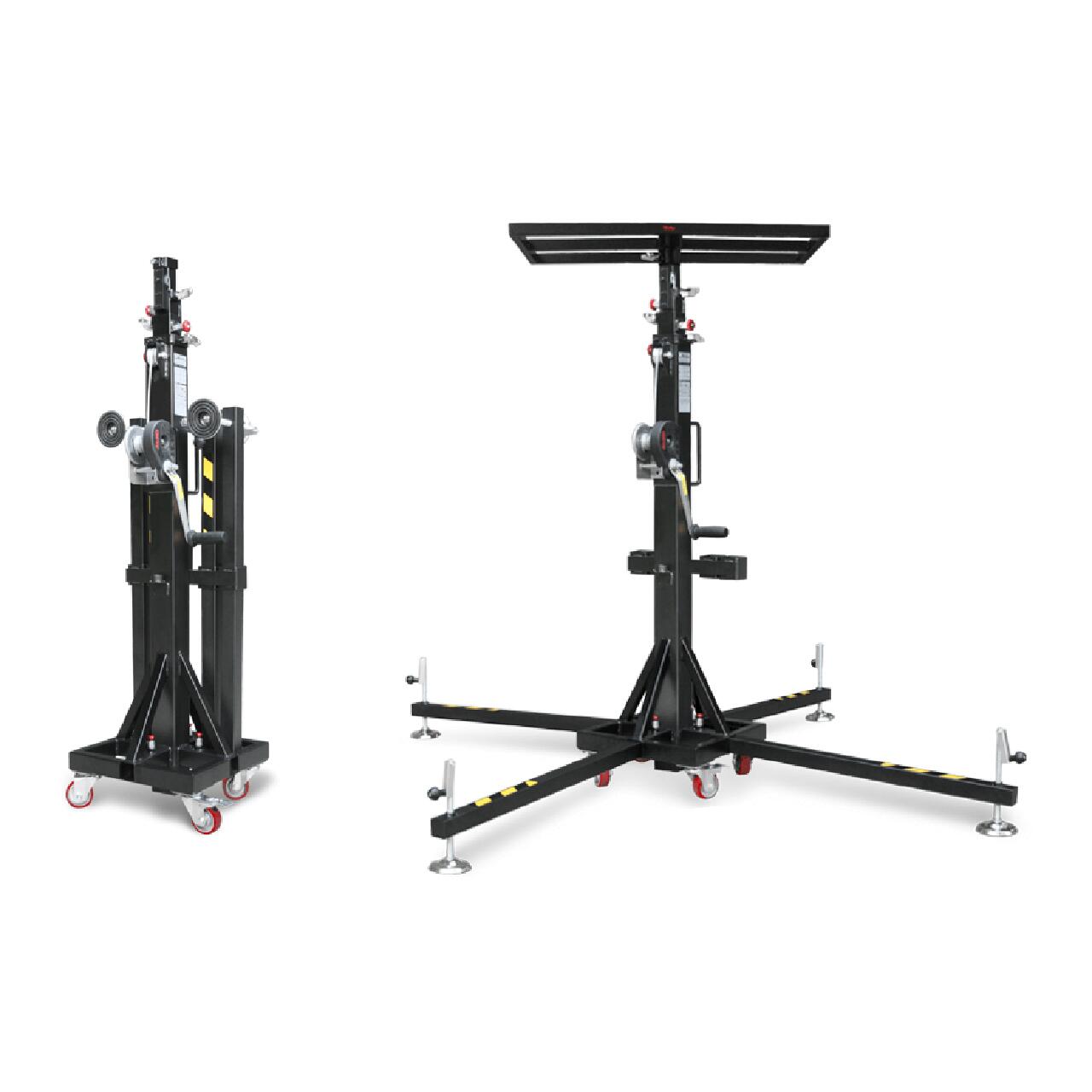 Turn de ridicare telescopic certificat special pentru a ridica sarcini de până la 150 kg (330,69 lb) până la o înălțime maximă de 4,50 metri (14′ 9,16″). Acest turn de ridicare compact este special conceput pentru un transport ușor atunci când este pliat (are o înălțime pliată de doar 1,53 m)